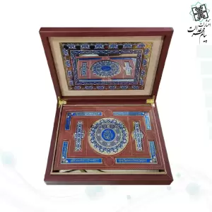 این محصول زیبا و نفیس قرآن کریم از نوع وزیری می باشد , که نوع جلد آن چرم مصنوعی برشی پلاک دار به همراه قاب صندوقی باز شو چرم مصنوعی لیزری برشی پلاک دار با طراحی بسیار زیبایست , نوع کاغذ این کتاب از جنس معطر لبه طلایی با کیفیت خوبی است . این محصول زیبا شامل 604 صفحه و با ابعاد (18 در 24) و ست کامل این محصول زیبا با ابعاد (21 در 27.5)با وزنی معادل 2.445 گرم می باشد .