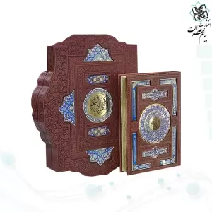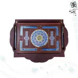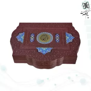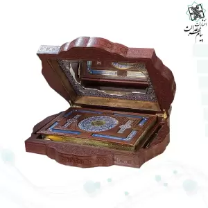 قرآن وزیری معطر بدون ترجمه چرم جعبه دار طرح صدف با آینه پلاک دار با خودکار و روان نویس