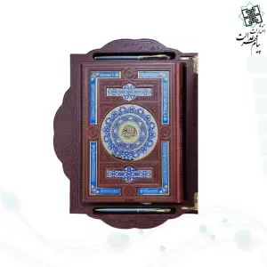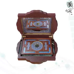 قرآن وزیری چرم جعبه دار طرح صدف با آینه پلاک دار با خودکار و روان نویس