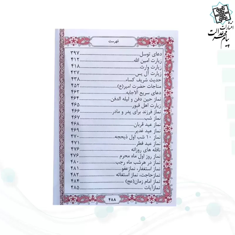 این کتاب شامل ادعیه پرکاربردی چون دعای کمیل، زیارت عاشورا، دعای ندبه، زیارت آلیاسین، دعاهای ایام هفته و بخشهایی از مفاتیح الجنان است.
